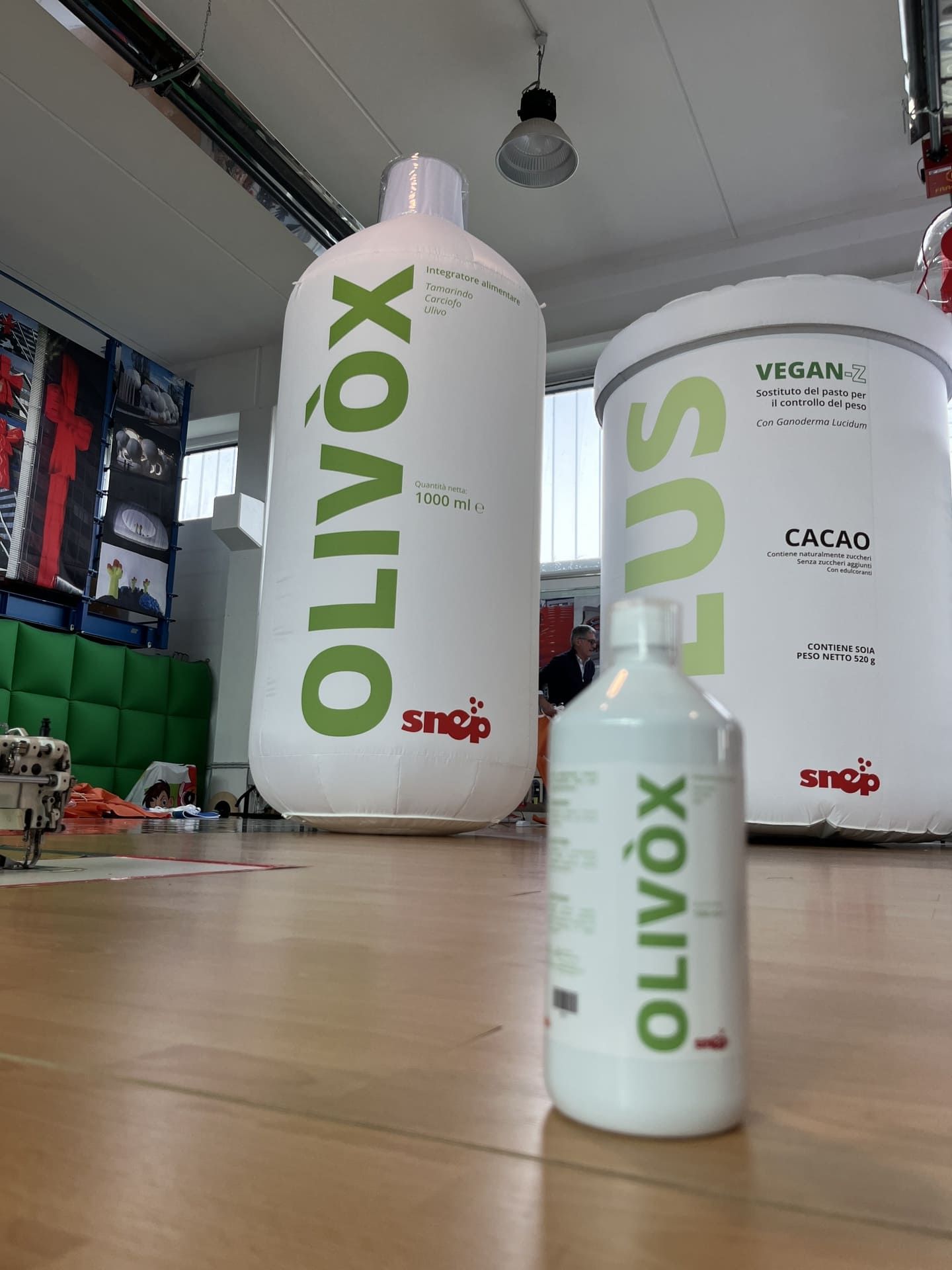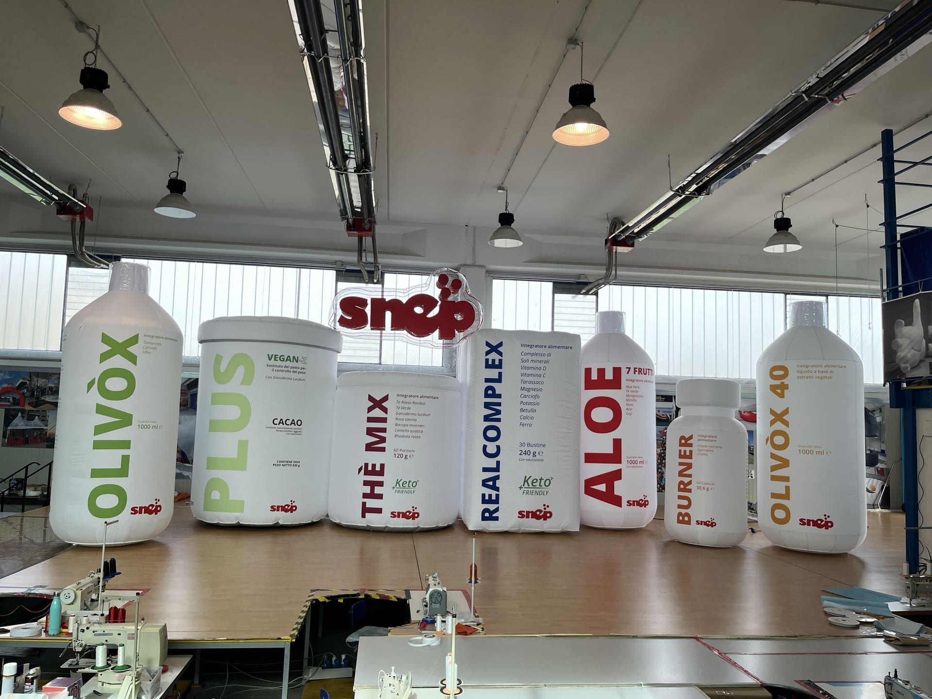 Per il lancio promozionale della linea di integratori alimentari firmata Snep, abbiamo progettato e realizzato una serie di gonfiabili su misura, pensati per valorizzare l’identità visiva del brand durante un evento dedicato. L’intero allestimento è stato studiato per offrire una rappresentazione fedele e riconoscibile dei principali prodotti della linea, trasformandoli in elementi scenografici di grande impatto.