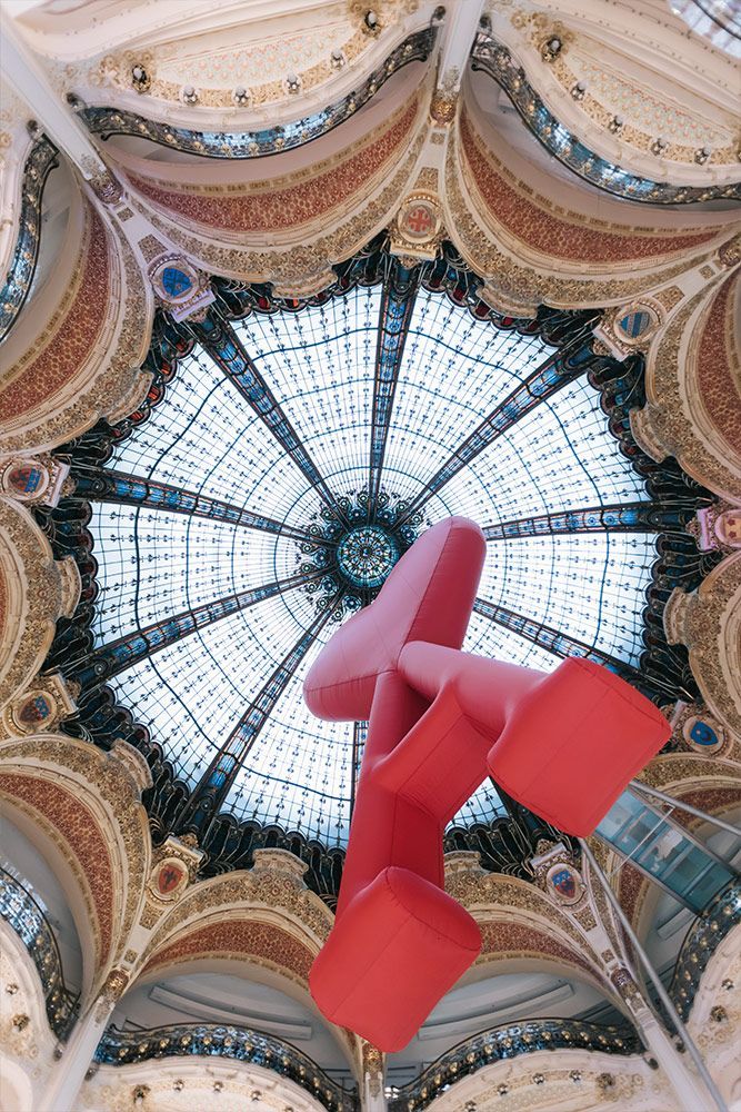 The 3 sculptures were built in different sizes and set up in various locations: the largest, 15 metres high, was suspended in the Grand Coupole while the second, 7.5 metres high, was located in the Atrium Homme; the third, 2.8 metres, was displayed above the Pop Up in the central entrance of Galeries Lafayette.