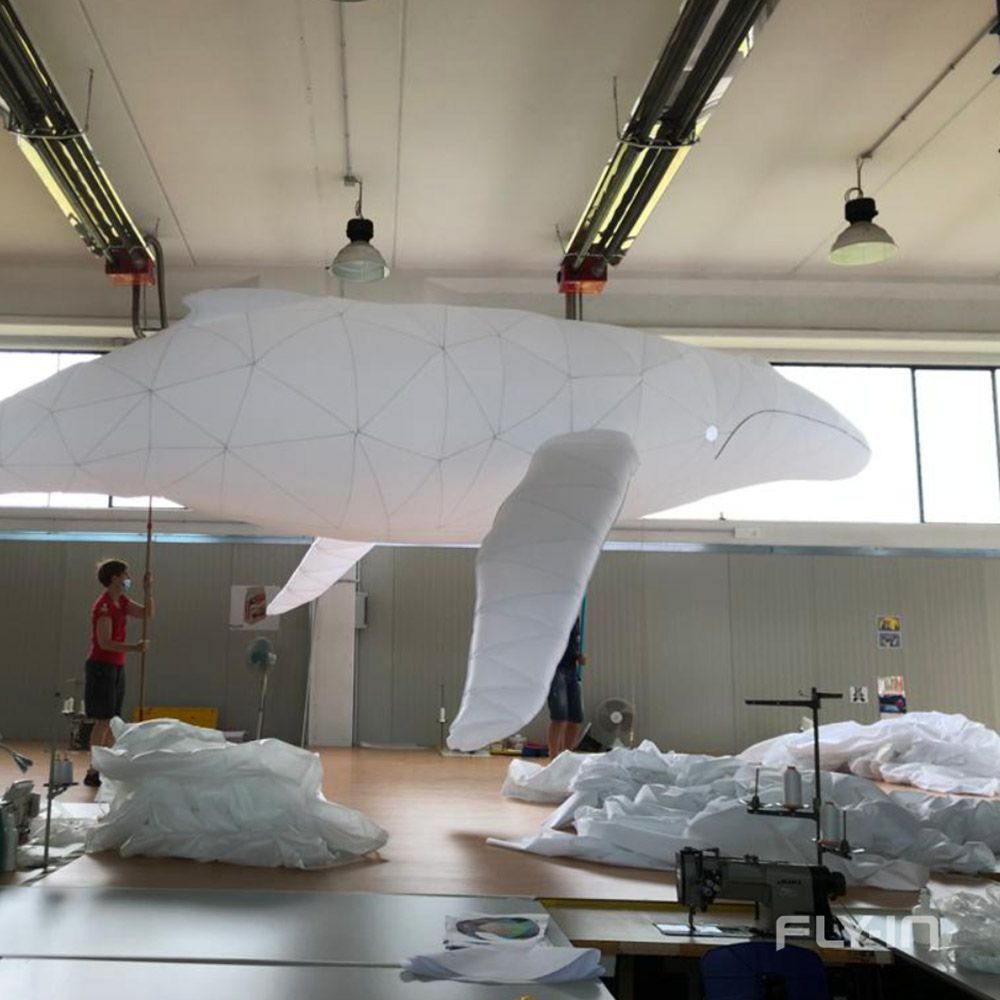 Due le richieste del cliente: la prima, una struttura a “mesh” che, illuminandosi, valorizzasse la composizione di triangoli. La seconda, che la megattera potesse “nuotare” sul pubblico gestendo i movimenti con due semplici aste.