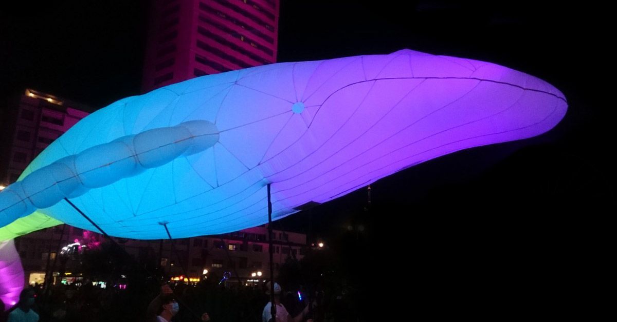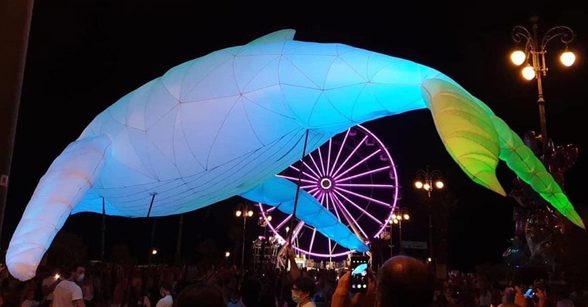 Sky Whale, una megattera ideata per lo spettacolo della Notte Rosa di Cesenatico, produzione artistica firmata Cardinali Group.